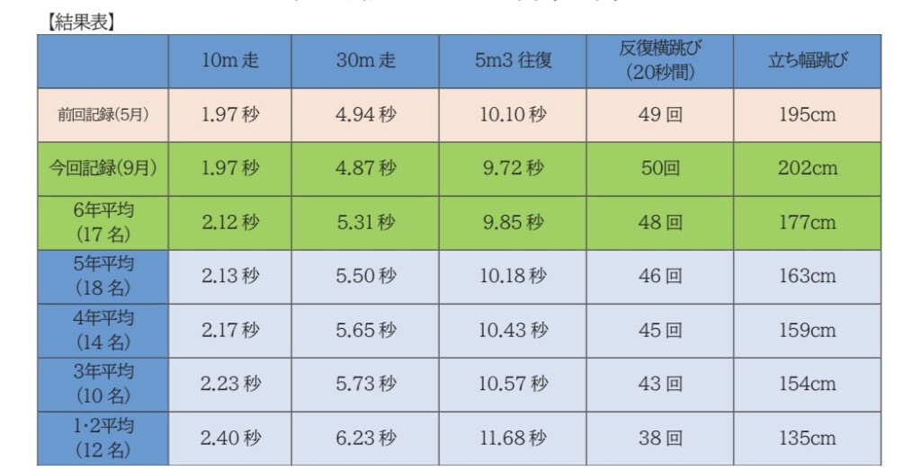 各学年毎の平均記録や、5月に第1回テストを行ったスクール生は、第1回からの記録を比較することが出来るようになっています。